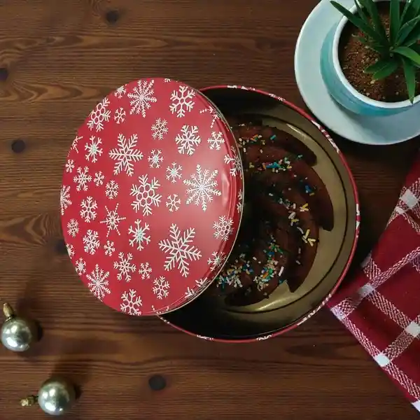 Caja metalica, redonda, roja, copos de nieve, con torta Ring cake vainilla con decoracion navideña de 615 gms, 12 porciones aprox. o con miini muffins de arandanos. Diametro: 69 cm-Largo:21 cm- Alto: 9cm.Sujeto a disponibilidad de la refencia del empaque y productos disponibles.