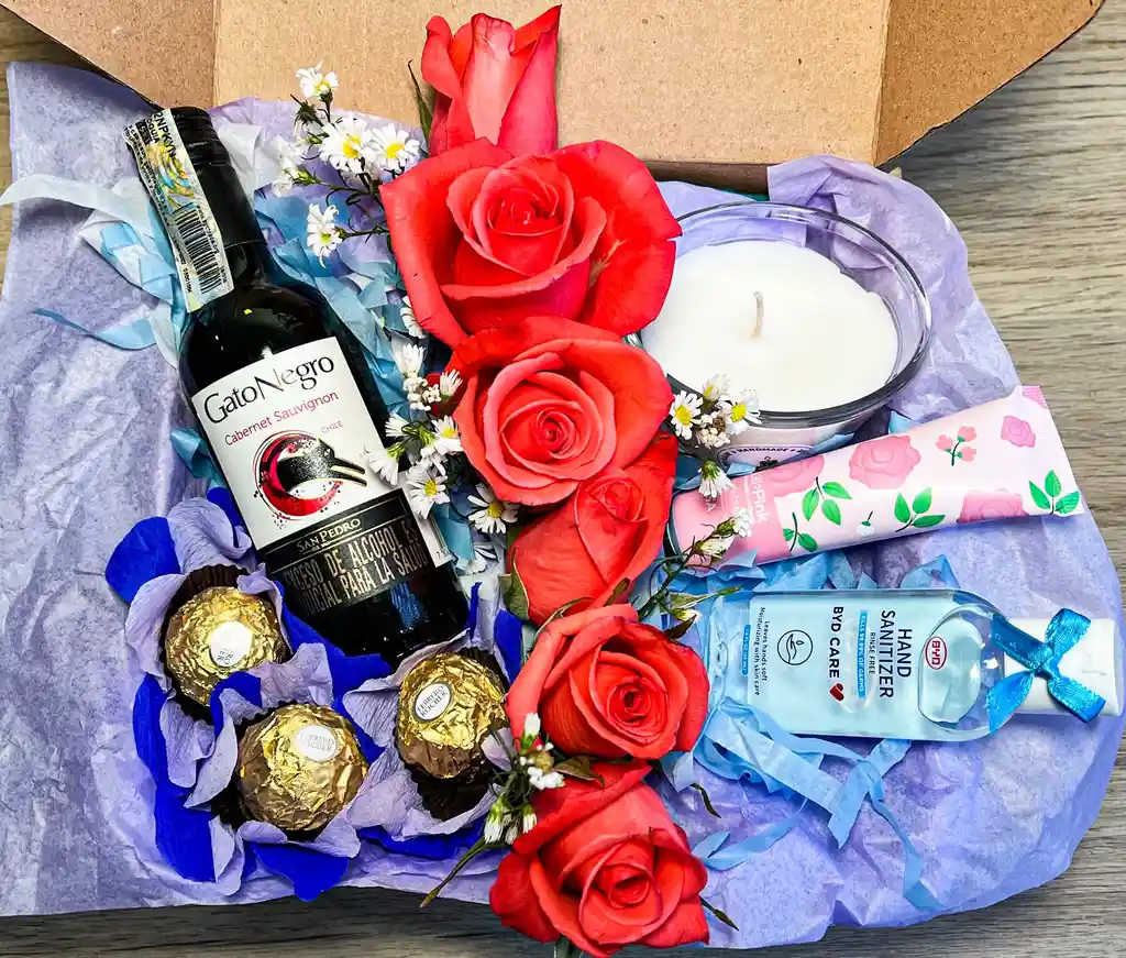 Bouquet de flores Vino botella mini (187ml) Chocolates Ferrero Rochelle Crema de manos humectante Vela de soya con coco Gel antibacterial