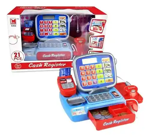 permite jugar a tener el supermercado ideal. Incluye calculadora digital con sonido al presionar cada número, balanza donde se puede simular pesar los alimentos, escáner donde simular leer el código de barras con sonido, caja donde colocar las monedas o billetes, presionando el botón, la caja se abrirá. Para niños mayores de 3 años. Permite facilitar la simulación, el juego de roles, la comunicación y aprender los cálculos matemáticos diarios. Desarrolla la curiosidad en los niños para recrear escenas de la vida cotidiana, fomentando la coordinación y la colaboración del niño.