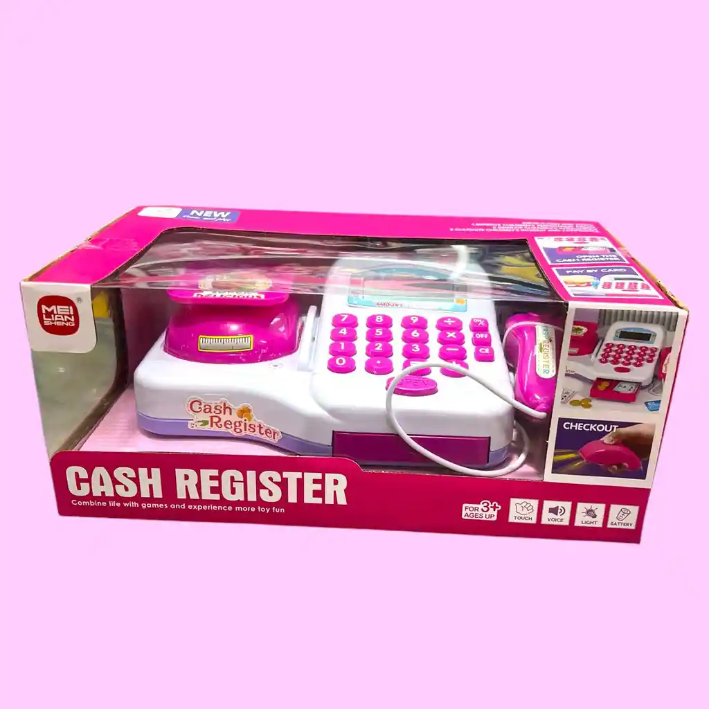 Una caja registradora de color rosa que cuenta con luces y sonidos para una experiencia de juego más realista. Tiene un cajón para el dinero que se abre al empujarlo, un panel LCD y una calculadora real para hacer cálculos. Además, incluye un lector de código de barras para simular la lectura de productos y una balanza para simular que se pesan los productos. No incluye frutas y verduras.