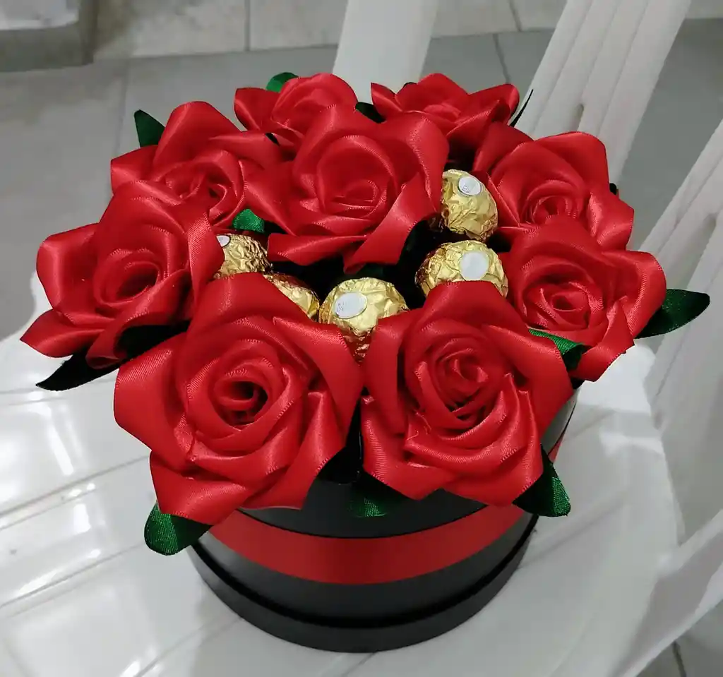 Caja cilindro negra rellena de rosas rojas preservadas más bombones de chocolate