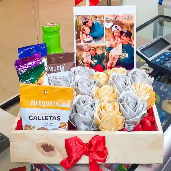 Cajita de madera con rosas eternas, unos deliciosos snacks saludables y un retablo en acrílico 100% personalizado. Para una mayor atención personalizada y ultimar detalles comunícate al WhatsApp 3142273513.
