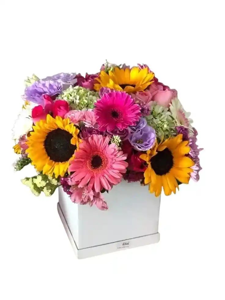 Una caja cuadrada con una combinación armoniosa de flores variadas, 3 GERBERAS , 3 GIRASOLES , 6 rosas minis , 10 claveles y 2 hortencias ideal para sorprender con un regalo lleno de color y frescura. Nota: La flor puede ser sustituida dependiendo de la disponibilidad de color y del producto. "Mensaje Personalizado" máximo de 30 caracteres (Dejar el mensaje en el chat, los comentarios no se previsualizan para la tienda, por lo que si se dejan allí no podrá ser incluido).