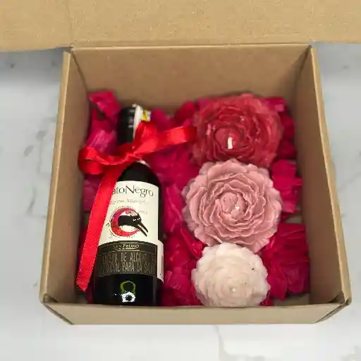 Caja que trae piba de vino tinto marca gato negro , dos flores grandes y una pequeña viene en caja de cartón con moño y tarjeta : Regalo o detalle perfecto san Valentin