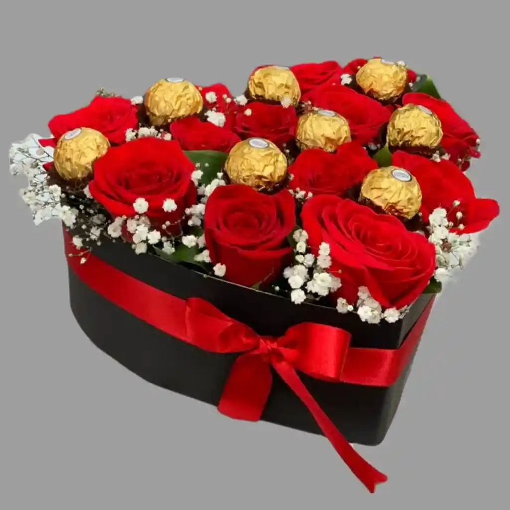 hermosa caja con docena de rosas, y 8 chocolates ferreros, con caja reutilizable y tarjeta personalizada