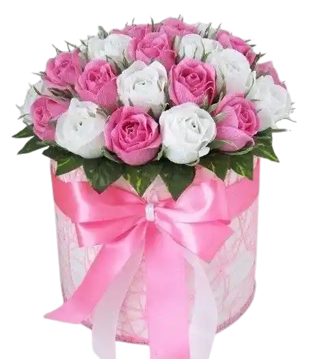 Un encantador arreglo en tonos rosa y blanco que irradia ternura y elegancia. Finas rosas cuidadosamente dispuestas en una caja decorativa con cinta de satén rosa pastel, creando una presentación sofisticada y armoniosa. Perfecto para regalar en ocasiones especiales como cumpleaños, aniversarios o para expresar cariño y dulzura con un detalle inolvidable.