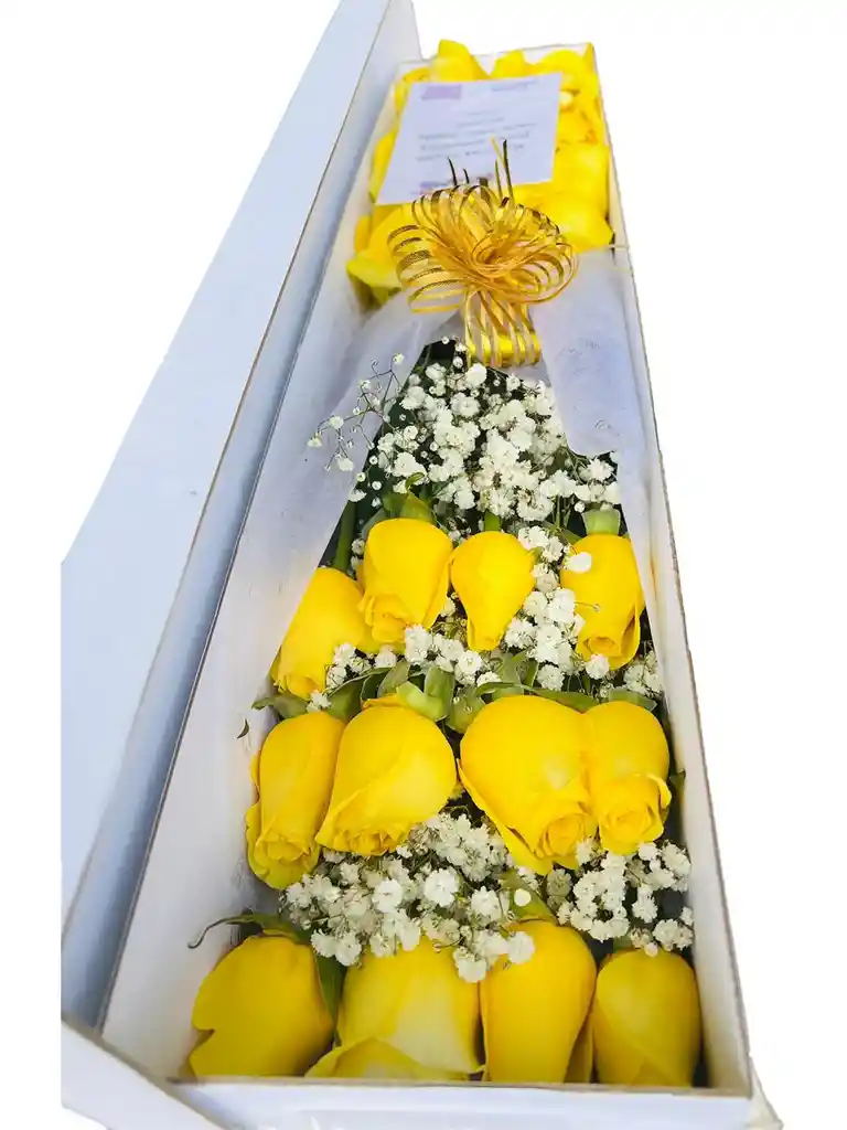 Arreglo floral x12 rosas tipo exportación en tonalidad amarillo Diseño elaborado en caja rectangular de cartón troquelado blanca Follaje fino rusco, gipsófilia Moño satín dorado