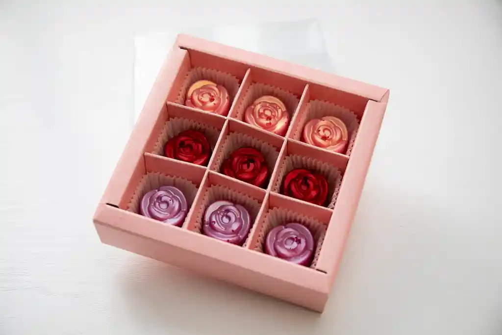 Caja de 9 rosas de chocolates rellenos surtidos, de 3cm de diámetro, decorada con hermoso moño en cinta tela. Sabores: Arequipe Frutos Rojos Durazno