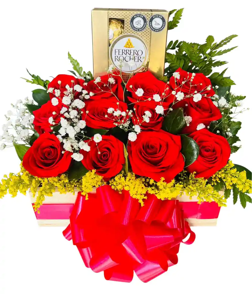 Arreglo floral x12 rosas tipo exportación en tonalidad rojo Chocolates ferrero rocher caja x4 unidades Follaje fino brillantina, gipsófilia, solidago Moño en satín rojo Diseño elaborado en caja de madera 10x15