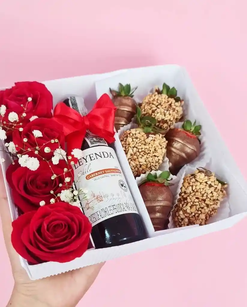 caja rosas vino 185ml y 6 fresas