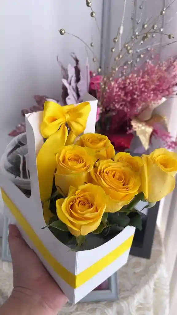 6 rosas amarilla y un vaso de fresas con 6 fresas