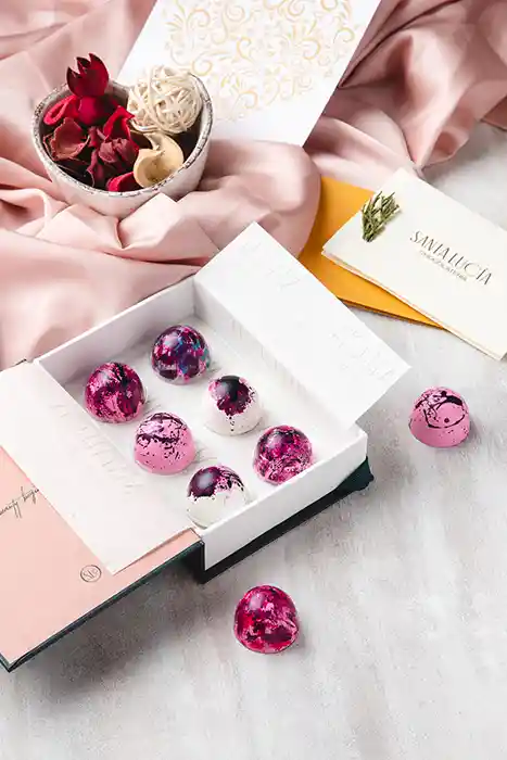 Es chocolate real al 53% de cacao (semiamargo) con relleno de caramelo, crocante de chocolate, frutos rojos, coco y fantasía crocante (caramelo con trozos de almendra maní y galleta). Las cajas incluyen tarjetas con mensaje personalizado no mayor a 2 línea (recuerda especificar si desea que lleve el nombre del remitente)