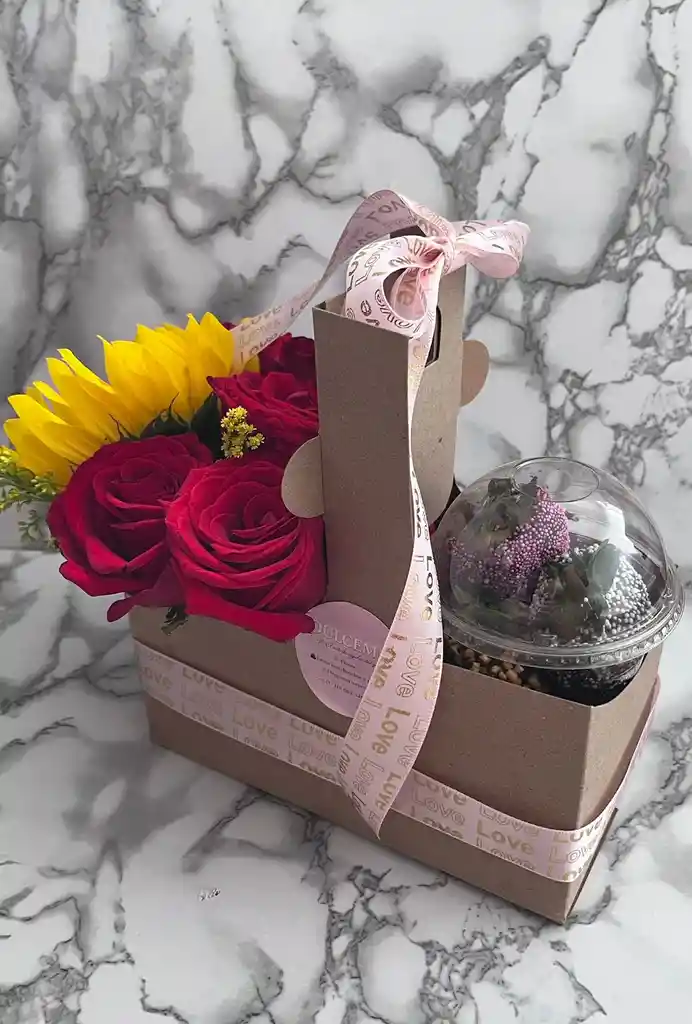 Contiene 1 girasol,4 rosas+un vaso de fresas cubiertas en chocolate o vaso de parfait+cinta de elección