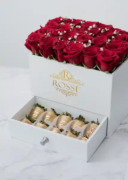 Nuestra Ref. Caja Rubí: Elaborada Con 24 Rosas Naturales y Hortensias (Opcional) Más 10 Fresas Cubiertas de Chocolate (Blanco/Negro/Rosado/Azul/Amarillo) y Toppings (Maní/Coco/Chispas de Chocolate/Perlas Plateadas). Este Producto Va Envuelto En Tull Blanco Con Lazo y Tarjeta.