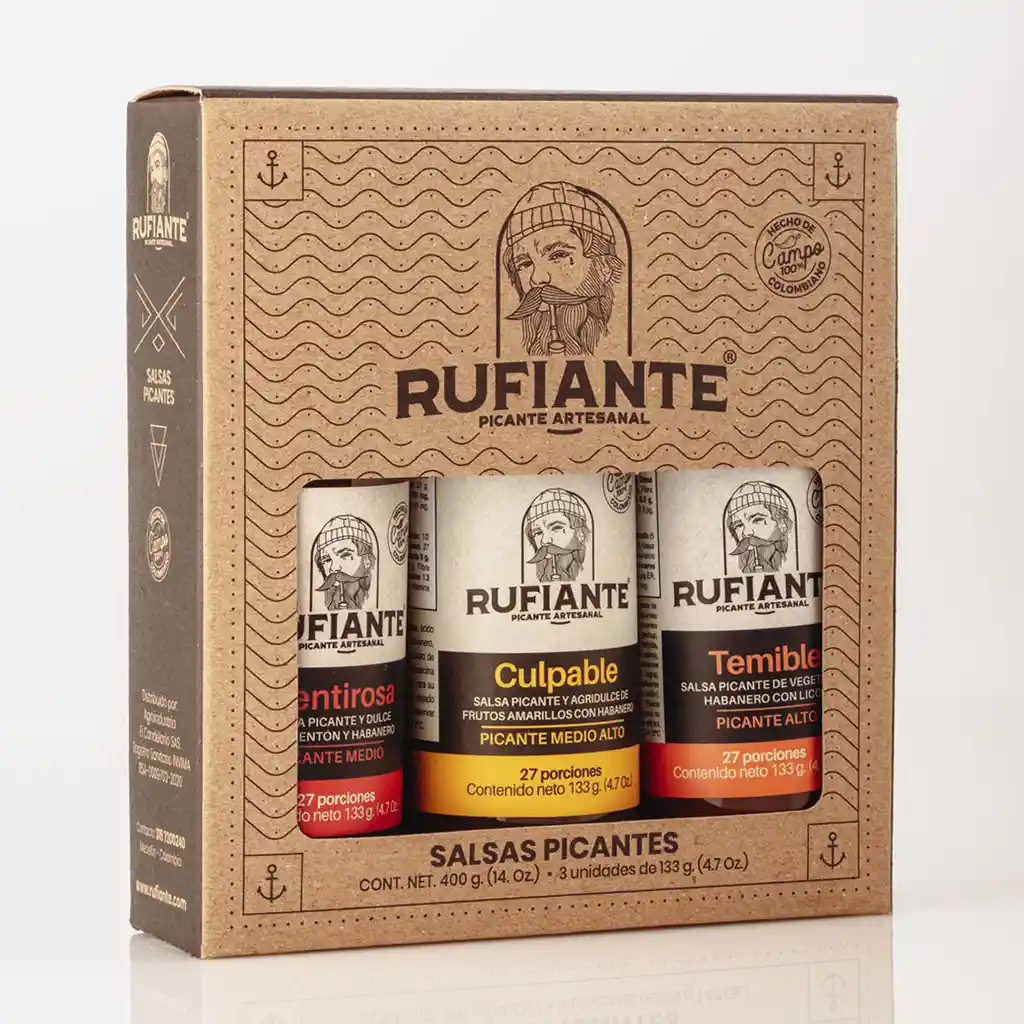 Caja Rufiante x3 salsas Picantes de 133 gr cada una. SOLO VIENE CON SABORES. MENTIROSA: Pimientos asados y chiles. NIVEL DE PICANTE MEDIO. Dulce y picante. CULPABLE: Frutos amarillos y chile habanero. NIVEL DE PICANTE MEDIO ALTO. TEMIBLE: Chile Habanero y Licor. NIVEL DE PICANTE: ALTO Productos con Registro sanitario RSA-0009703-2020