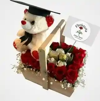 Hermosa caja de madera con rosas rojas, peluche con birrete y chocolates, ideal para sorprender con un toque tierno y especial.
