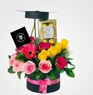 Colorido diseño con rosas rosadas, amarillas, gerberas y chocolates tipo Ferrero, decorado con birrete. Perfecto para quienes aman los detalles alegres y diferentes.