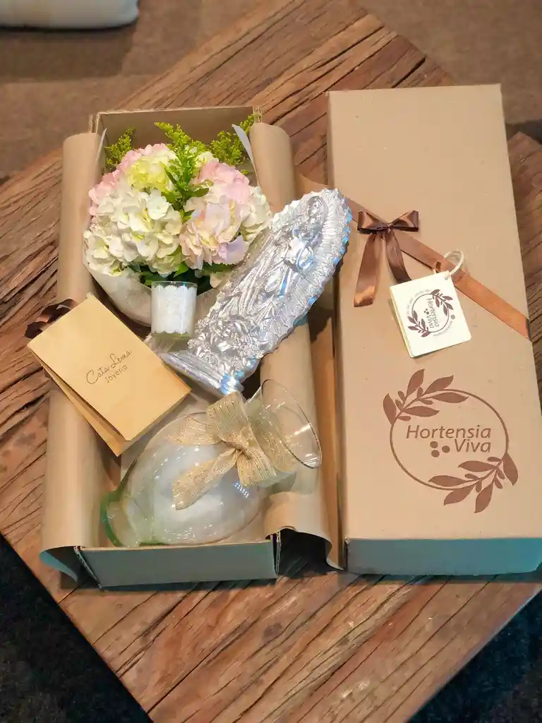 Caja con hortensias surtidas, virgen de Guadalupe, jarrón, vela, rosario, instrucciones de cuidado, alimento para la flor y tarjeta personalizada