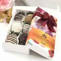 3 fresas cubiertas de chocolate blanco y negro, 3 cubiertas de maní, coco, chips de chocolate.
