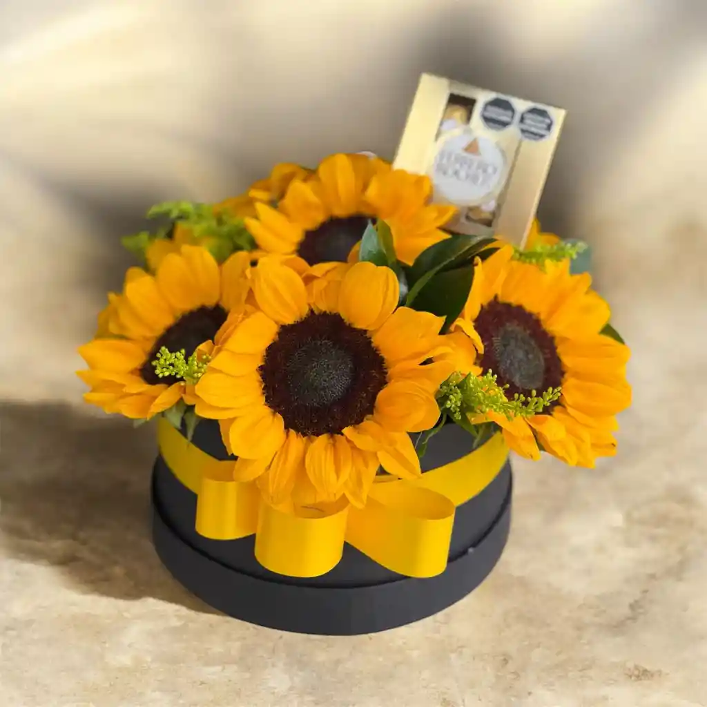 Cofre de girasoles y chocolates elaborado en caja decorativa
