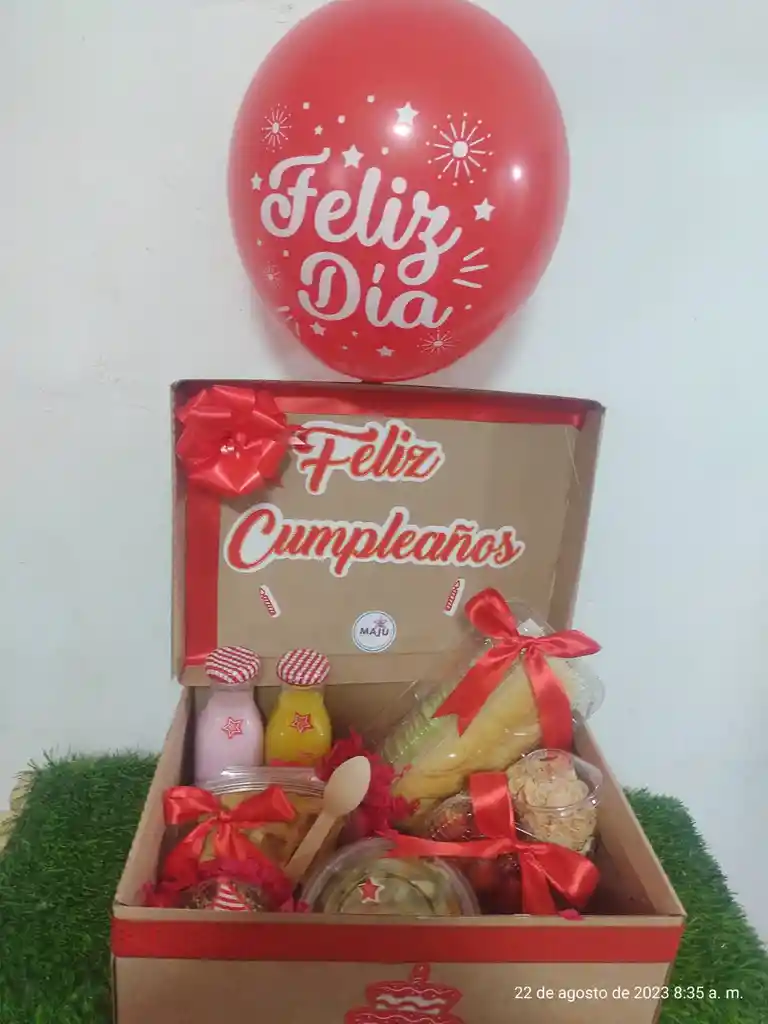 ancheta en caja con wafle, , sándwich, jugo, yogurt, cereal, torta con velita, fresas, mango y kiwi,