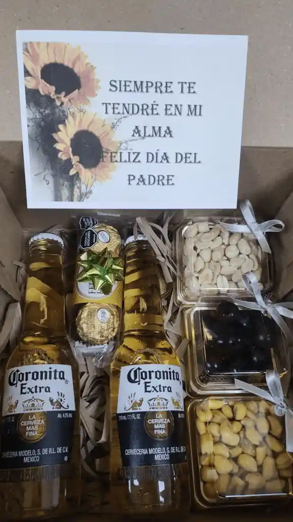 Sofisticada caja sorpresa para tu persona favorita 🫶🏽 llevando en ella dos cervezas corona 🍻 con deliciosas cajitas con maní y aceitunas....para darle el mejor acompañamiento....