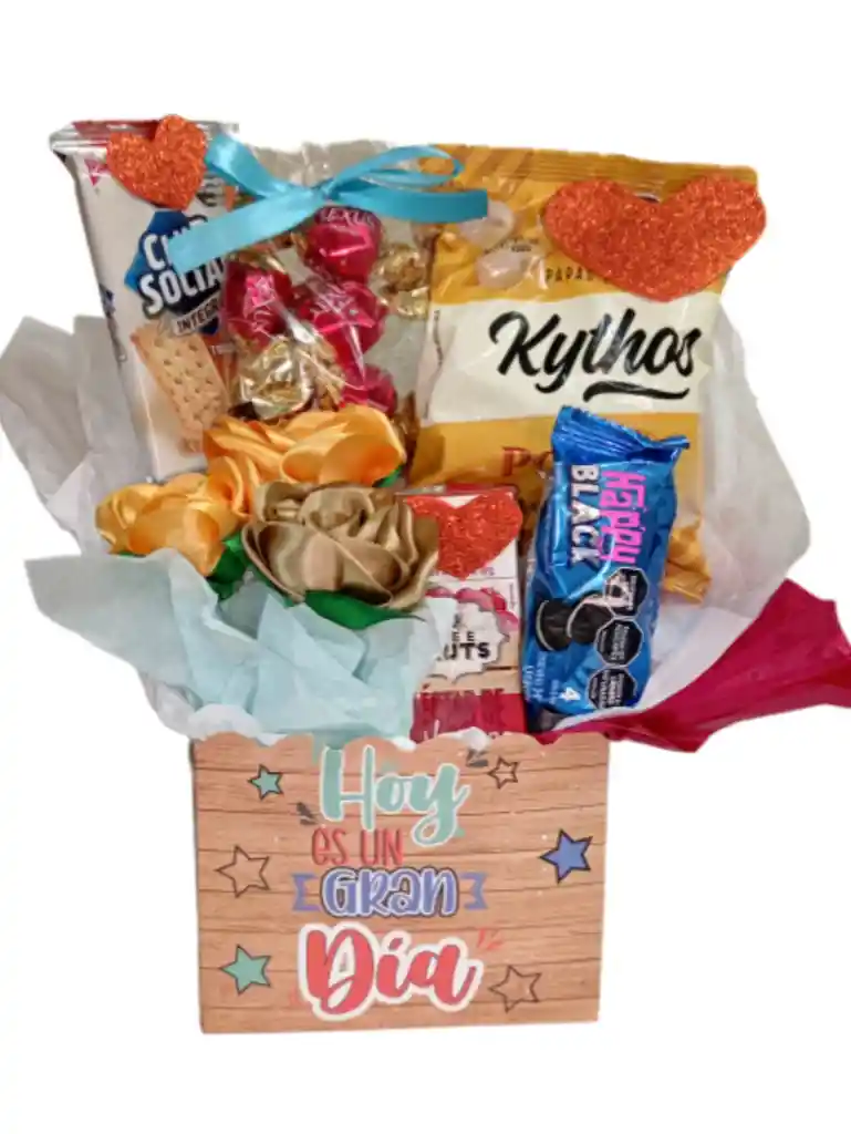 hermosa ancheta endulzada con comestibles, bebida, y chocolates, tambien incluye 3 flores eternas en color amarillo y dorado que simboliza la amistad y la importancia de esa persona, asi que sorprende con tu mensaje personal e incluye globo sencillo