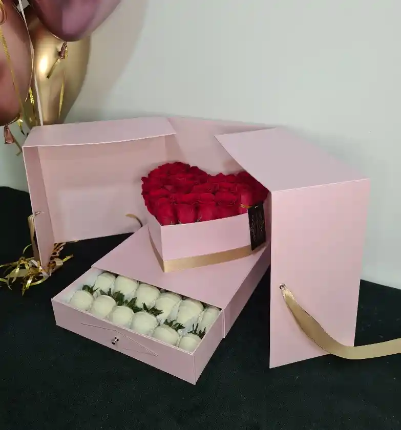 AGENDAR CON MÍNIMO 3 HORAS DE ANTICIPACIÓN. Caja mágica con rosas y fresas con chocolate. Incluye tarjeta DE-PARA. Color de rosa a disponibilidad. Color de caja negra o rosada.