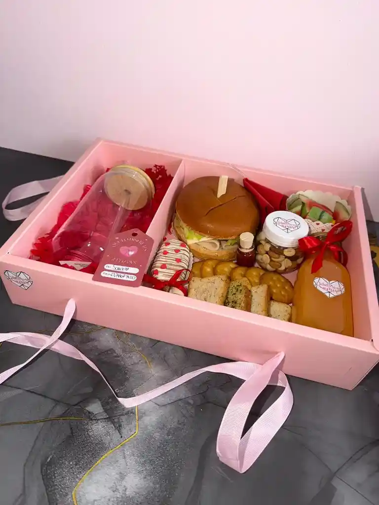 Sorprende con un detalle lleno de amor, sabor y momentos especiales. Te incluye sandwich gourmet, jugo de naranja en frasco de vidrio, mix de fruta, mix de maní, snacks surtidos y una deliciosa choco-paleta rellena de nutella. Adicional te incluye un vaso pitillo de vidrio . Puedes personalizar el color de la decoración y el mensaje de la tarjeta personalizada.