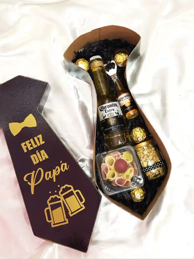 Hermoso detalle en forma de corbata para sorprender a un hombre. Incluye: ✔️Coronita ✔️Destapador ✔️Mini tabla de queso ✔️Ferreros ✔️Jar de frutos secos