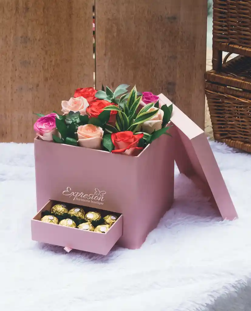 Elegante Caja Versátil con Cajonera contiene: 8 Rosas, 3 Suculentas, 8 Chocolates marca Ferrero.