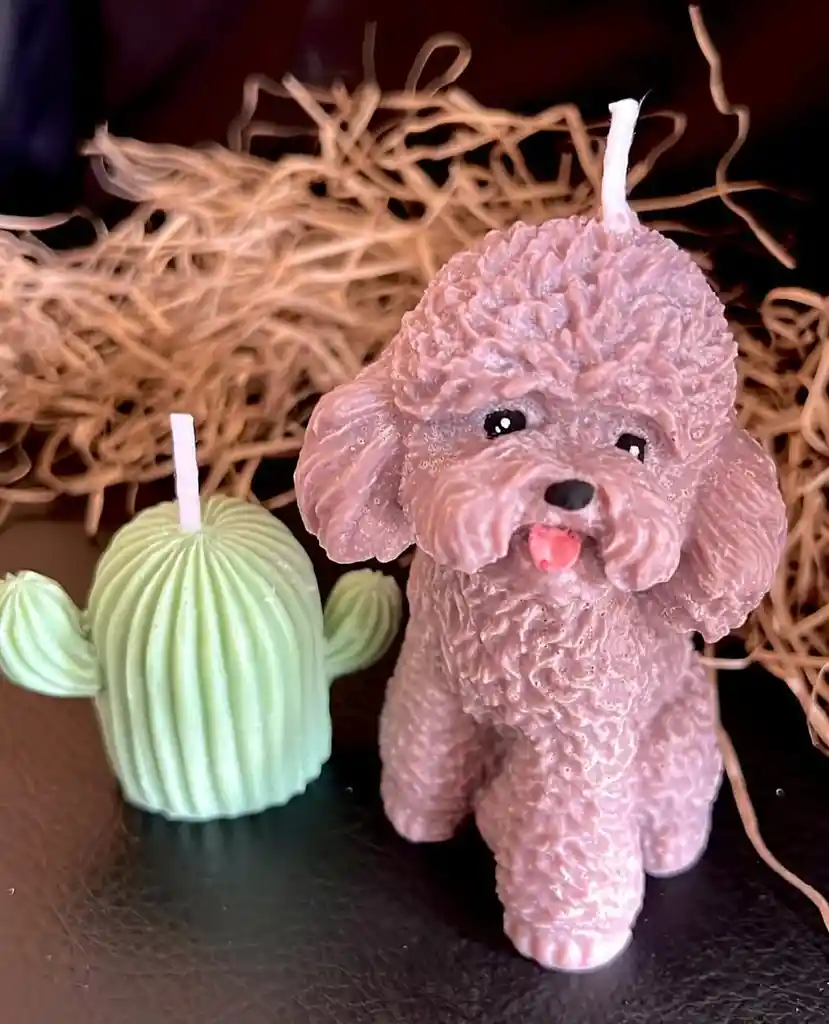 Set de velas decorativas y aromatizadas: de un perro, acompañado de un cactus. Las convierten en piezas perfectas para decorar cualquier espacio con un toque cálido y natural, este set es ideal como regalo especial o para quienes buscan una combinación de ternura y elegancia en su decoración.