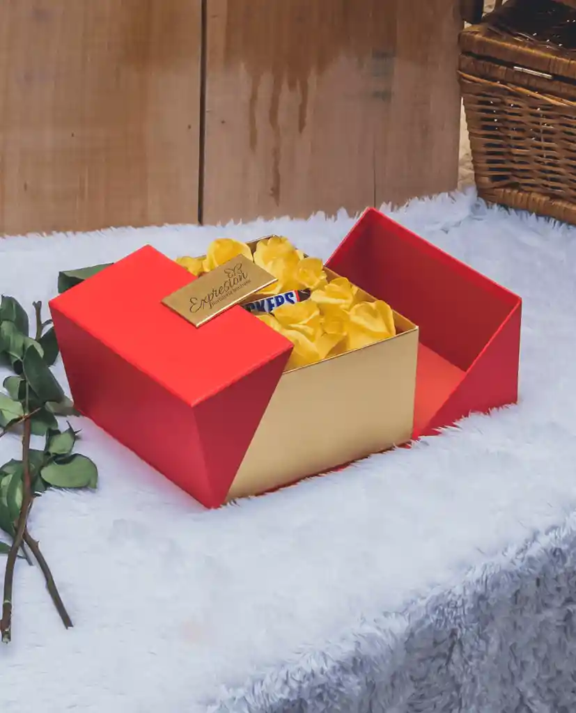 Caja versátil con apertura bilateral con 12 A 16 rosas y chocolate Snickers en el interior. *Color de las flores está sujeto a disponibilidad