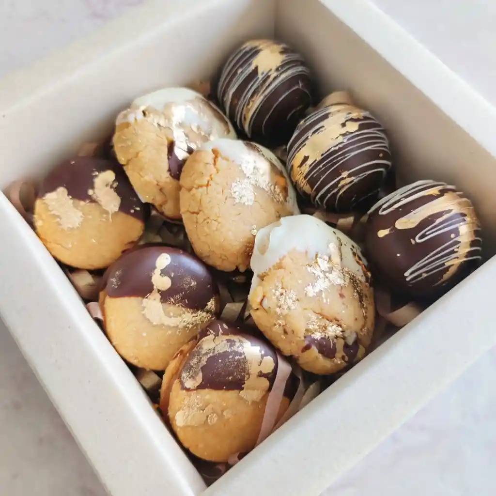 3 ALFAJORCITOS DE MANTEQUILLA DE MANI CON AREQUIPE SIN AZUCAR Y CHOCOLATE 70% CACAO, 3 GALLETICAS DE MANTEQUILLA DE MANI CON NUECES TROZOS DE CHOCOLATE SIN AZUCAR Y CHOCOLATE BLANCO SIN AZUCAR, 3 TRUFAS RED VELVET ENDULZADAS CON STEVIA CON MANTEQUILLA DE MARAÑON Y CHOCOLATE 70% CACAO