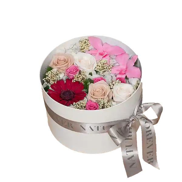 Caja de Lujo con exquisita combinación de orquídeas, gérberas y hortensia en su interior. Altura: 16 cms. Diámetro: 22 cms.