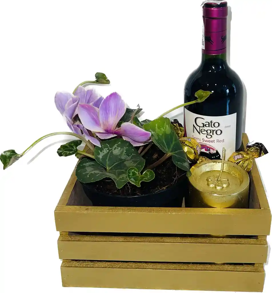 Caja tipo guacal, Violeta de los Alpes, Vino Gato Negro 750Ml, Vela decorativa, Chocolates.