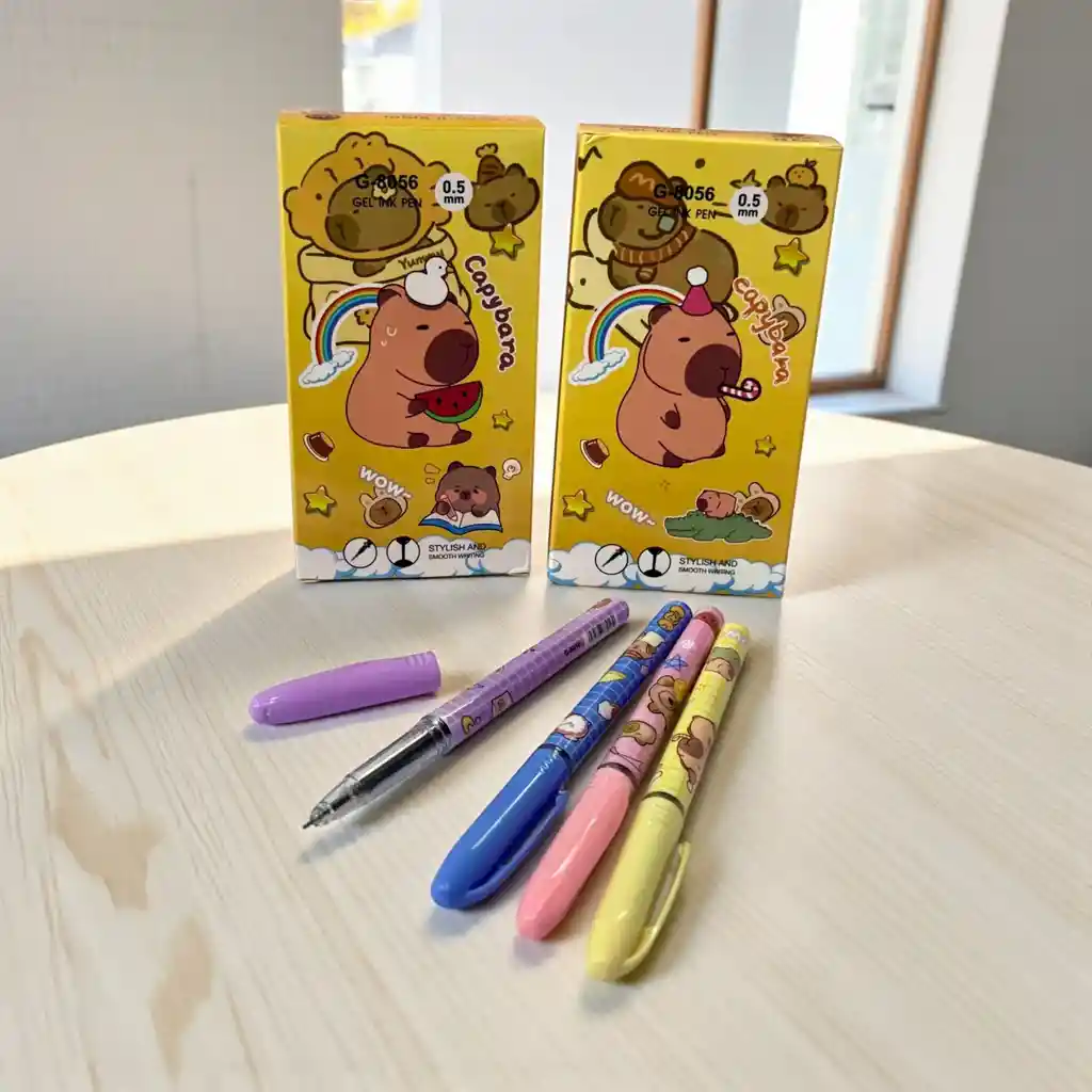 Tinta de gel negra de 0.5 mm. Diseño "kawaii" con capibaras ilustradas en el cuerpo del bolígrafo y en la caja. Escritura elegante y suave. Se venden en juegos o estuches. Diseño con núcleo de pluma reemplazable, lo que los hace respetuosos con el medio ambiente.
