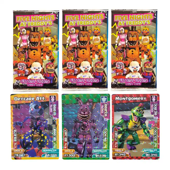 Cartas Coleccionables Holográficas de Five Nights at Freddys Premium Edition Incluye: 50 sobres de cartas (3 cartas x sobre/ 150 cartas en total) Marca: Genérica. No son colección Panini. ¡Explora el emocionante mundo de Five Nights at Freddys con esta increíble colección de 150 cartas de juego coleccionables! Sumérgete en la oscura y misteriosa atmósfera de este famoso juego mientras desentrañas los secretos de Freddy Fazbears Pizza. Cada carta es una obra maestra única, presentando a tus personajes favoritos como Freddy, Bonnie, Chica y Foxy, así como a los temibles animatrónicos que acechan en la oscuridad. ¡Colecciona y intercambia estas cartas para armar tu propio equipo estratégico y enfrentarte a tus amigos en emocionantes batallas! Estas cartas de juego son perfectas para fanáticos de Five Nights at Freddys, coleccionistas y jugadores. Somos Andicell Soluciones.