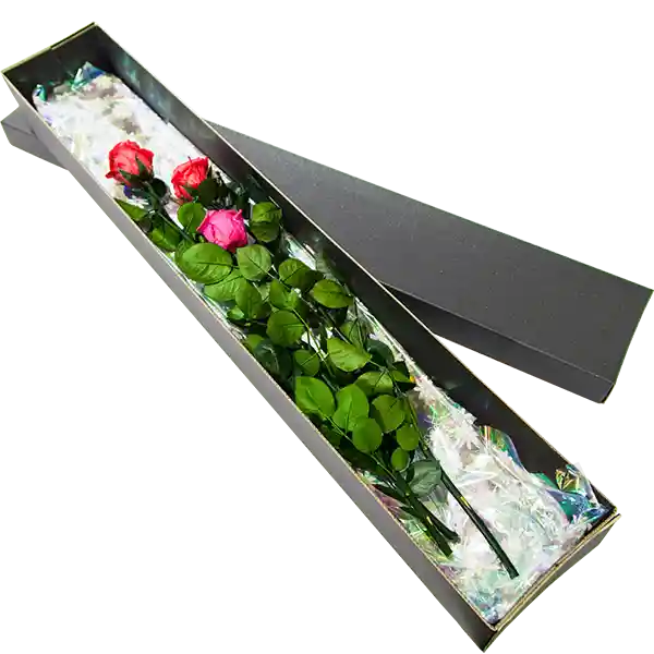 Caja de cartón microcorrugado con una 3 rosas estándar naturales preservadas, (9cm diámetro y 50cm tallo) perduran intactas por meses, envueltas en papel seda. Caja decorada con cinta satín. Tamaño de la caja 70cmx13cmx9cm. Incluye tarjeta.