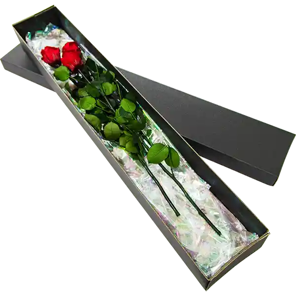 Caja de cartón microcorrugado con una 3 rosas estándar naturales preservadas, (9cm diámetro y 50cm tallo) perduran intactas por meses, envueltas en papel seda. Caja decorada con cinta satín. Tamaño de la caja 70cmx13cmx9cm. Incluye tarjeta.