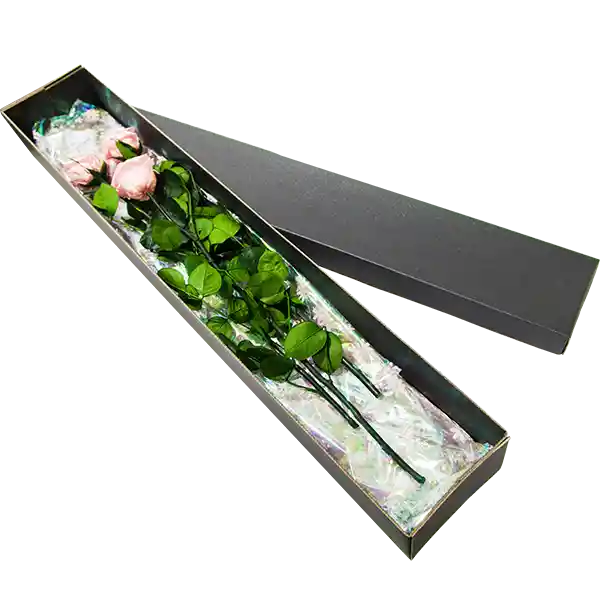 Caja de cartón microcorrugado con una 3 rosas estándar naturales preservadas, (9cm diámetro y 50cm tallo) perduran intactas por meses, envueltas en papel seda. Caja decorada con cinta satín. Tamaño de la caja 70cmx13cmx9cm. Incluye tarjeta.