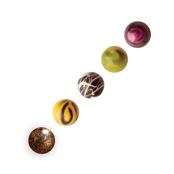 Elaborados en chocolate blanco y semiamargo rellenos de ganache de café.
