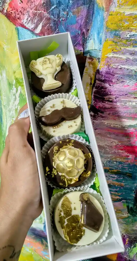 4 galletas oreo recubierta chocolate blanco y negro Decoradas (referencia a la imagen) caja decorada con moño y tarjeta