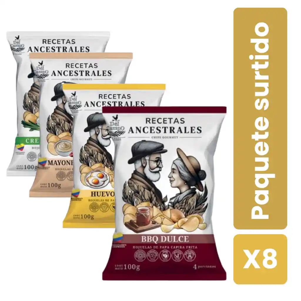 Caja X8 Papas Del Campo sabor Surtido Snack crujiente de papas capiras colombianas, frito en aceite de girasol 🌻. Producto 100% colombiano 🇨🇴 Sin sellos ✅ Vegano 🌱 Libre de gluten 🚫🌾 Libre de grasas trans