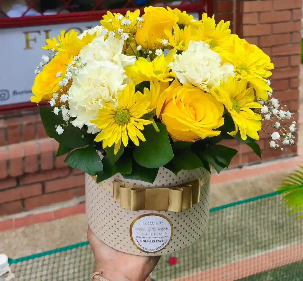 caja con variedad de flores y tonos amarillos