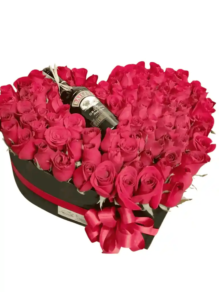 Delicada caja en forma de corazón decorada con rosas frescas y una botella de Baileys, ideal para regalar con estilo y buen gusto. Un detalle perfecto para celebrar el amor, agradecer o sorprender con un toque sofisticado y dulce. ✨ Ideal para cumpleaños, aniversarios o fechas especiales.
