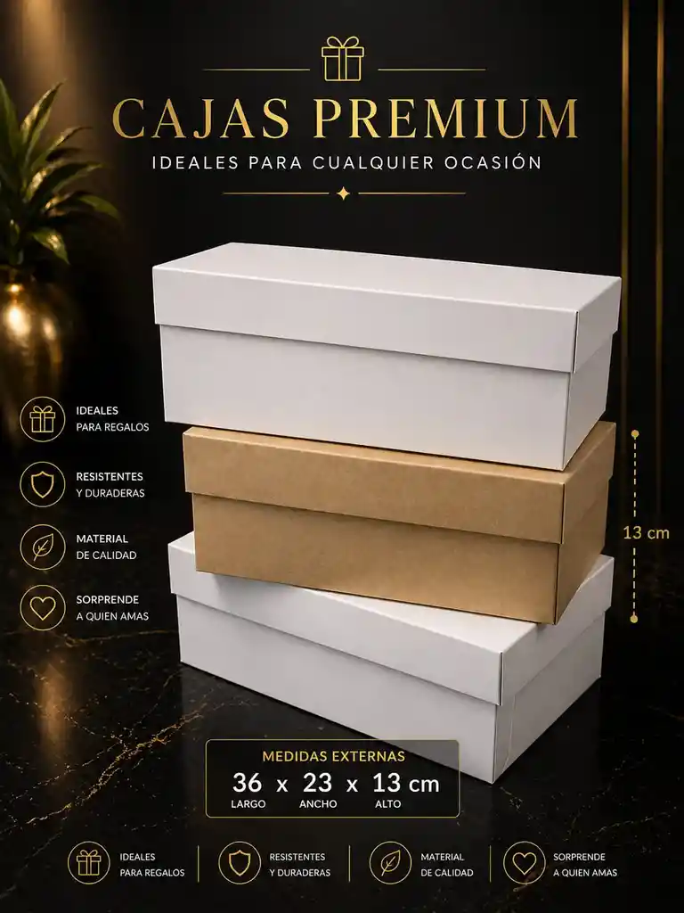 Cajas Premium para Regalos ✨🎁 Presenta tus detalles con elegancia y distinción. Nuestras cajas premium son ideales para crear regalos inolvidables, anchetas, desayunos sorpresa y todo tipo de celebraciones especiales. 📏 Medidas externas: 36 cm x 23 cm x 13 cm 🌟 Características: 🎀 Ideales para cualquier ocasión 💪 Resistentes y duraderas 📦 Elaboradas con material de excelente calidad 💝 Perfectas para sorprender a esa persona especial