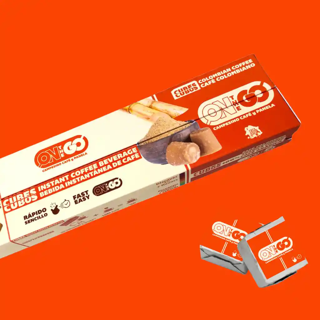 Caja x 20 cubos de café instantáneo endulzados con panela. No necesita máquina para su preparación. Activa con agua caliente, leche o bebida vegetal.