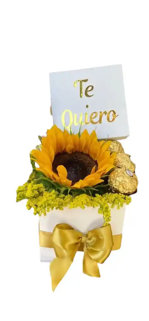 Caja conformada por un girasol y chocolates más un lazo