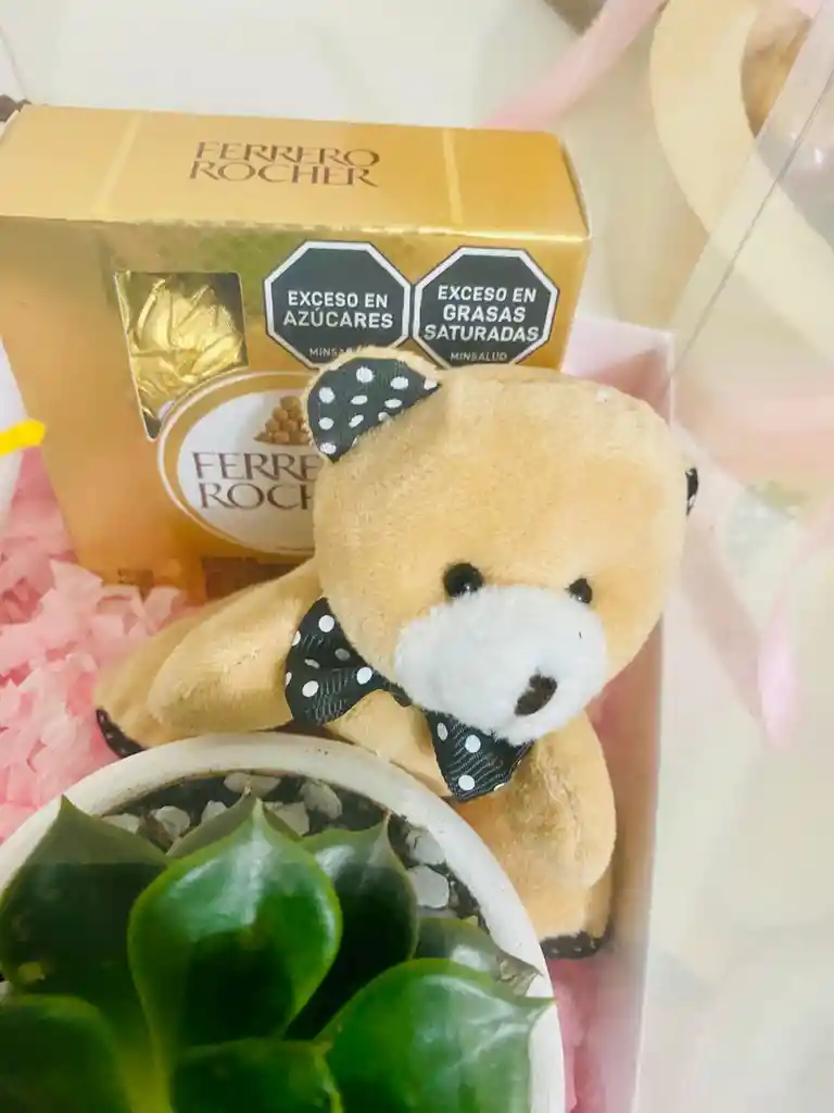 Hermosa Cajita de lujo, tapa de acetato, Suculenta natural (según disponibilidad) en materito de barro divino, piazzas, caja de chocolates Ferrero, osito mini de peluche y Masmelos de florecitas. Todo esto con letrero de Feliz Día Muje